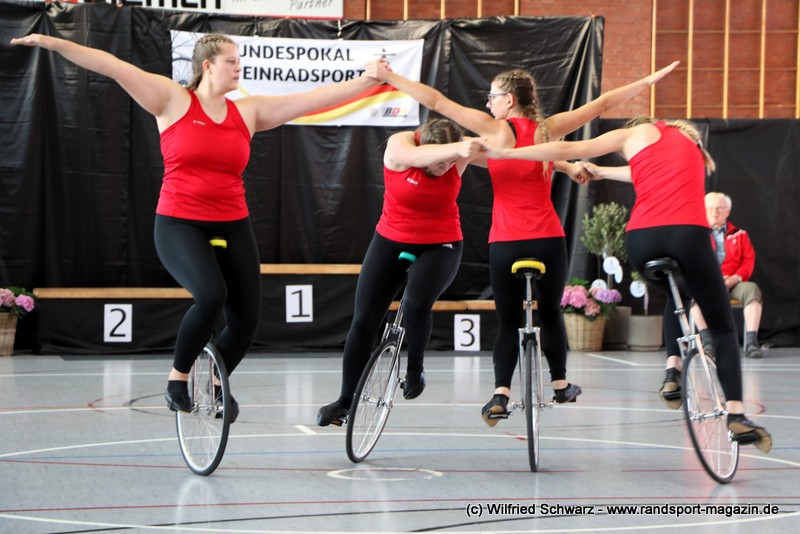 In Schwanewede wurden die beiden Einrad-Disziplinen, d.h. 4er und 6er, jeweils in der offenen Klasse ausgetragen. Somit traten alle Mannschaften egal ob Frauen oder Männer offen gegeneinander in der Offenen Klasse an. Im 4er Einrad gab es für den RMSV Aach in Vorrunde und Finale einen Doppelsieg, Franziska Bötzer / Alina Bötzer / Sarah Bötzer /Sabrina Bürßner gewannen mit Bestleistung vor Anika Meßmer / Hannah Elsässer / Janina Setzer / Natalie Grote. Oberesslingen war ebenfalls mit zwei Mannschaften am Start, Jenny Schäfer / Amelie Gölz / Vivien Schuler /Madeline Schuler belegten Platz 6 und Annett Horlacher / Marleen Aeckerle / Luisa Aeckerle / Kaja Luna Demuth Rang 8. Auch Ravensburg startete mit zwei Mannschaften in dieser Disziplin, sie belegten Platz 9 (Anja Joyce / Sarah Rudolf / Anja Linder / SarahTesch) und Platz 18 (Alisa Arndt / Julia Linder / Julia Gasser / Lucy Schaefer). Alle 6 Mannschaften werden bei der DM dabei sein.