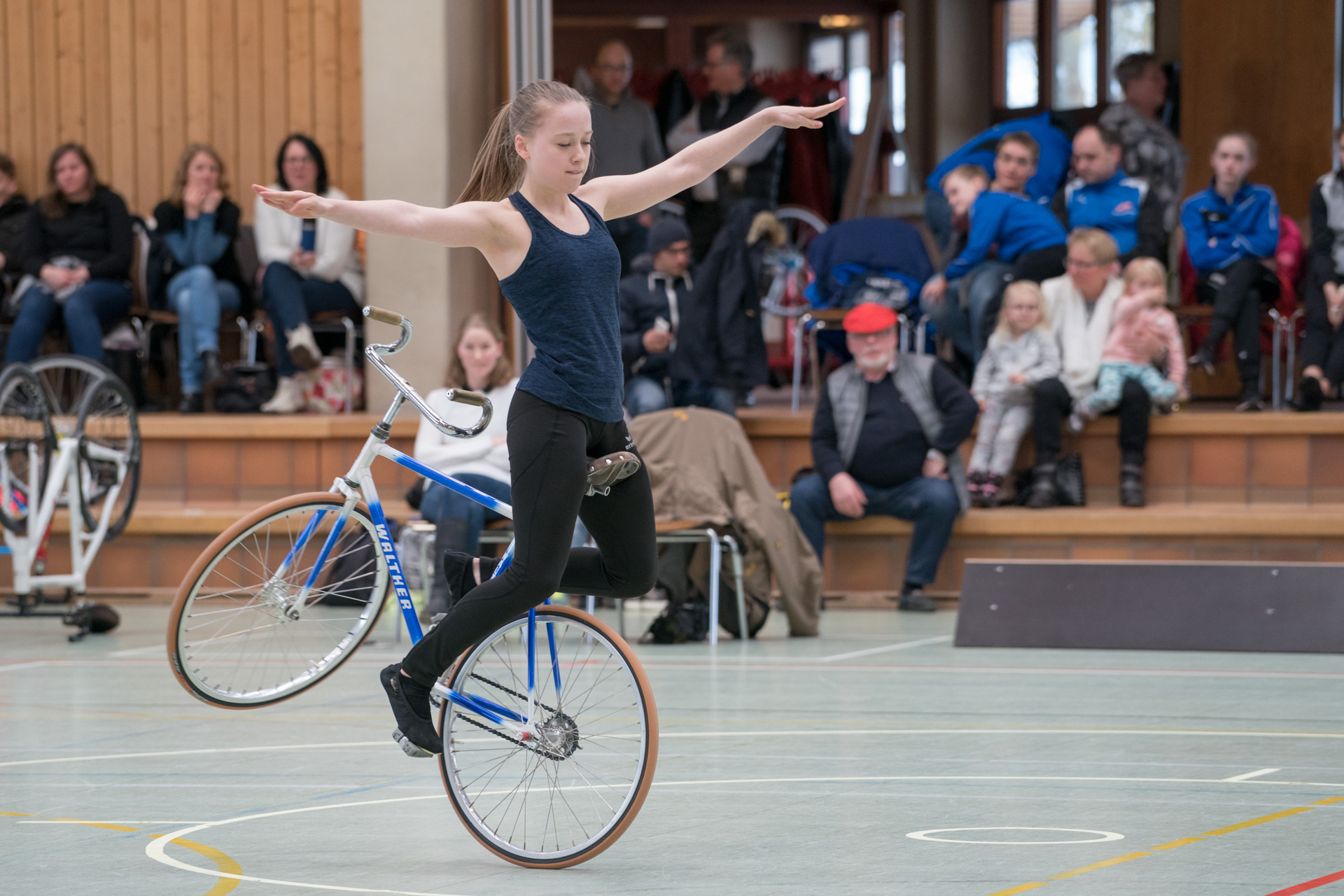 Im 2er der Juniorinnen gab es gleich 6 Paare aus Baden-Württemberg am Start. Annice Niedermayer und Alina Freisler vom RKV Denkendorf gewannen hier sowohl das Finale als auch die Vorrunde. Mit gerade mal zwei Punkten Rückstand belegten Anna-Sophia von Schneyder und Anika Papok vom RV Lottstetten Platz 3. Sie fuhren sehr sicher und gekonnt ihr Programm, bis auf eine kleinere Unsicherheit bei der Lenkerdrehung mit Dornstand, die sie aber gekonnt retteten, gab es für das Kampfgericht kaum etwas zu beanstanden. Mit weniger als 4 Punkten Abzug qualifizierten sie sich in ihrem ersten Juniorenjahr somit erneut fürs Finale. Auch dort beeindruckten sie wieder mit einer sehr sauberen und ruhigen Fahrweise, die auch die Kommentatoren (Weltmeister Lukas Kohl, Corinna Wirth, Sophia Hunold und Martin Führsattel) im Livestream von Sportdeutschland beeindruckte. Sie erhielten für ihre sehr anspruchsvolle Kür mit den Elementen Reitsitz/Handstand, Kopf-/Schulterstand, Kopfstand/Lenkerstützgrätsche auf einem Rad das erste Jahr nach dem Wechsel aus der Schülerklasse nicht nur viel Applaus vom Publikum sondern auch Lob und Respekt von den fachkundigen Kommentatoren. Für die beiden Lottstetterinnen zählen die Junior-Masters als Qualifikation für den C-Kader, denn bei der Qualifikation zur EM sind sie in ihrem ersten Juniorenjahr wegen ihres Alters noch aussen vor. Bei der Vergabe des Startplatzes bei der EM ist das Duo Niedermayer/Freisler jedoch mit dabei. Hannah Bothe/Julia Schondelmeier (RSV Gutach/Soli) hatten ebenfalls nur knapp 4 Punkte Abzug und konnten gleich vier Plätze zur eingereichten Position gut machen, sie kamen auf Rang 5. Ihnen folgten Tamara Böpple/Stella Rith (RV Bonalnden) und Lara Schneider/Tanja Österle (RSV Unterweissach) auf den Plätzen 6 und 7. Das Duo Ronja Zahn/Melissa Zörner (RSV Erlenbach) konnte nach einem Sturz mit Verletzung seine Kür nicht zu Ende fahren und fiel dadurch auf Platz 11 zurück.